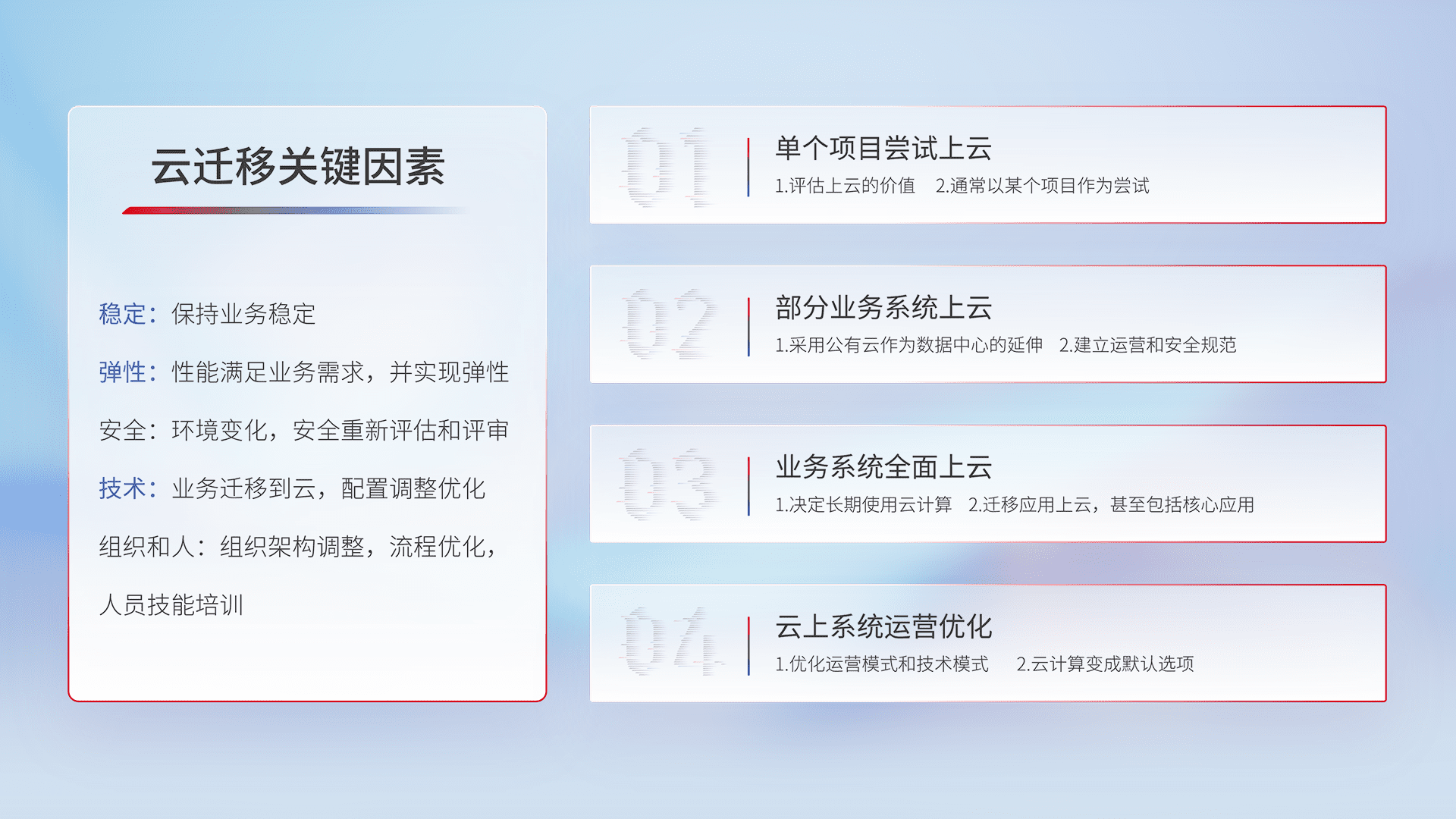 结合实际业务,,,,从规划设计、、、、云平台选型、、、、云原生改造、、、、数据迁移、、、集成交付,,,迁移全过程为客户识别最佳上云路径,,,,做好风险识别管理,,设计网络架构、、身份权限、、、安全审计合规、、操作审计、、、日志审计、、监控告警策略、、、多站点容灾设计等,,,,对云上基础设施进行整体规划,,,提升IT治理水平,,以满足弹性、、、高可用、、、、高性能的需求。。