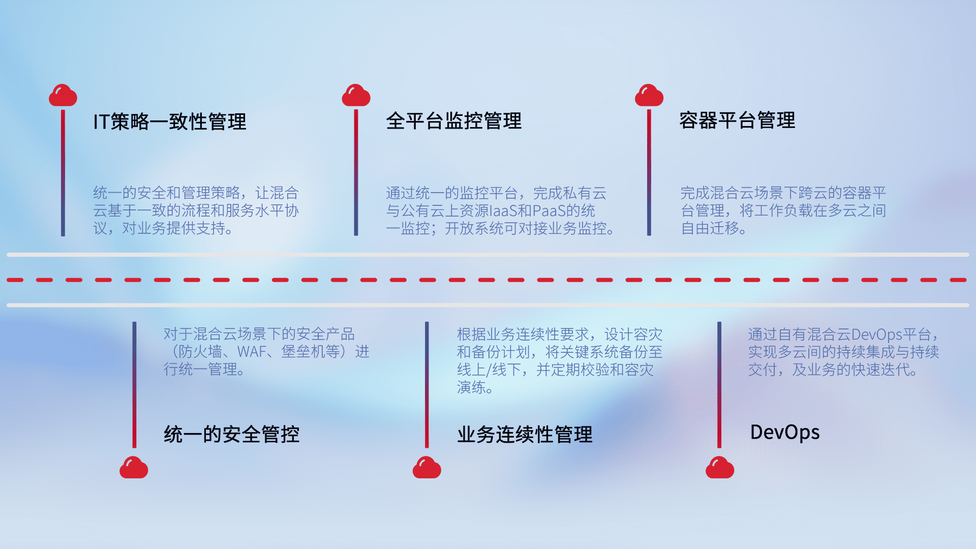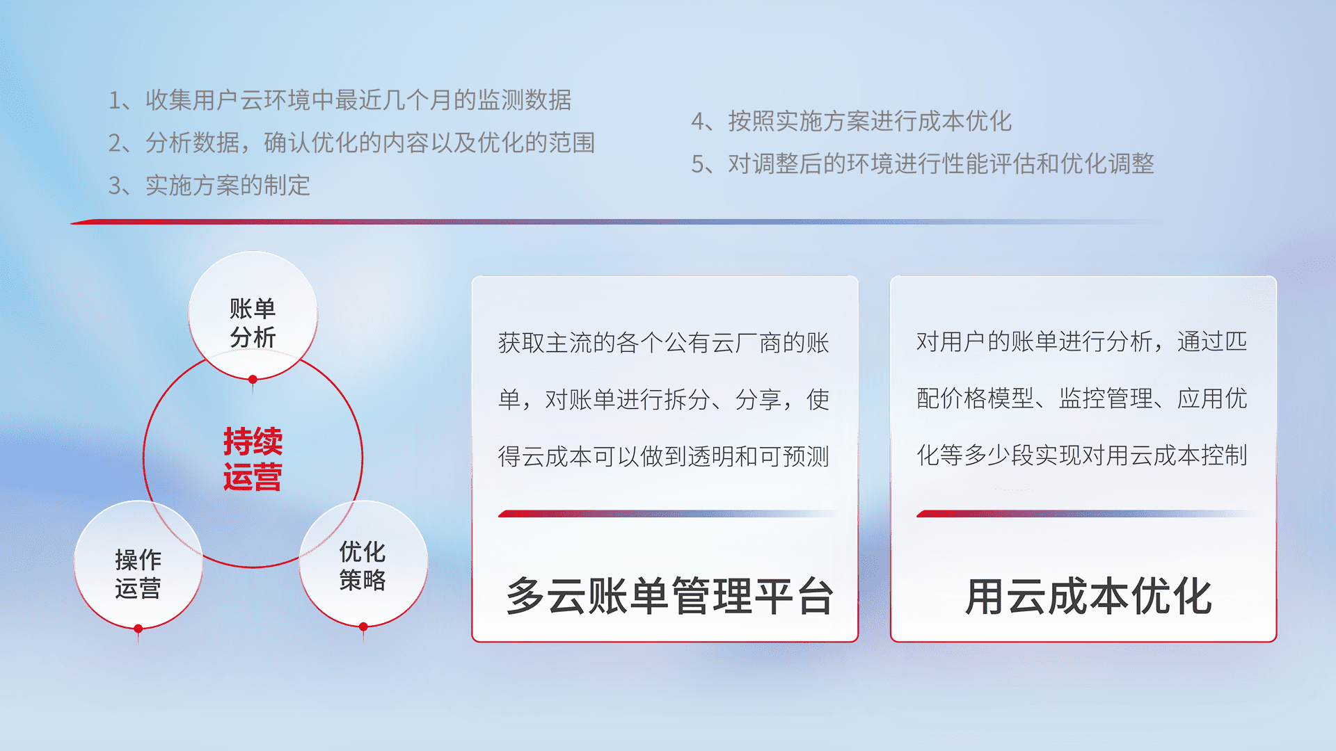 通过多云纳管,,,以统一的资源数据模型把客户的云资源进行抽象和封装,,,,进而实现对多云资源的统一操作,,保障云资源管理的可靠性、、、、稳定性与可用性。。量身定制化运维内容,,,配置、、开发运维、、、、补丁管理、、、、备份、、、监控、、、、认证和访问管理、、、审计和日常巡检等,,保障在用云过程中的可靠度,,,稳定度以及高可用率。。